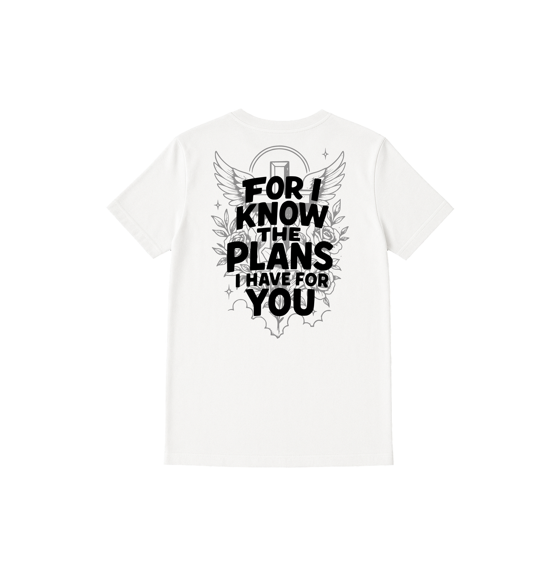 Every detail of this design reflects hope, purpose, and divine assurance. The verse is presented in elegant, scripture-inspired typography that reminds you—and everyone who sees it—that God’s plans are good and filled with promise.